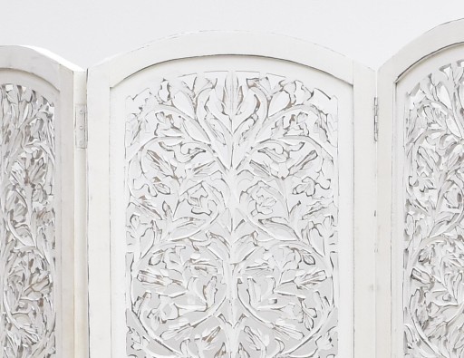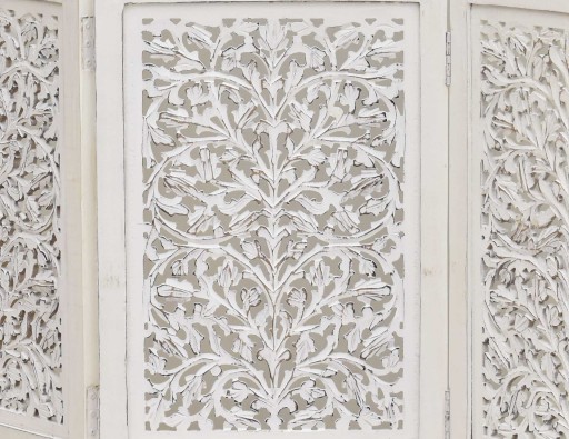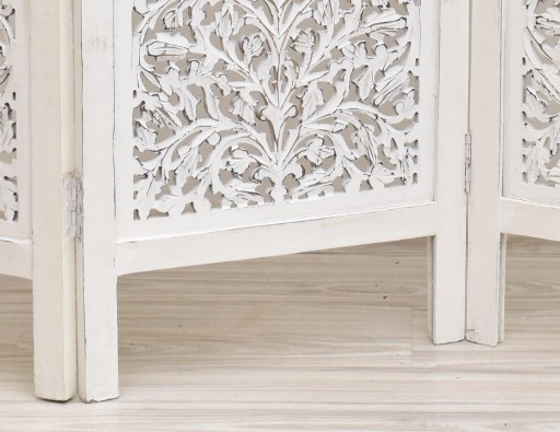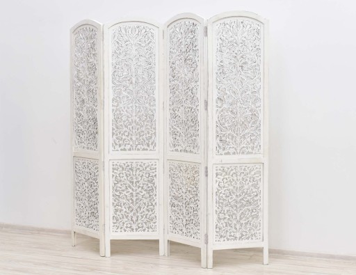Parawan 4 panelowy wykonany w Indiach pomalowany na biało, przecierany. Wymiar jednego panela: 45x2x180 cm.