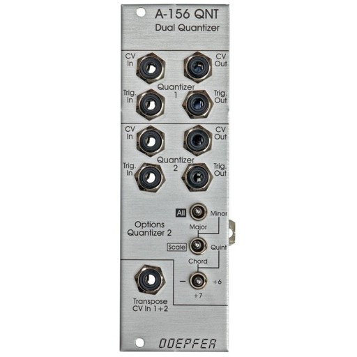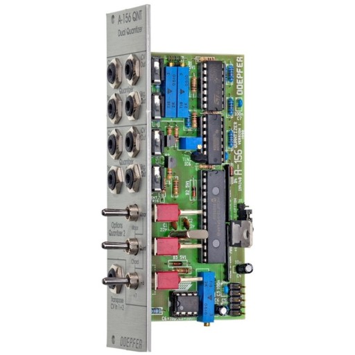 Moduł podwójnego kwantyzatora Doepfer A-156 posiada dwa kwantyzatory w jednym module. Każdy kwantyzator wyposażony jest w wejście CV, wyjście CV, wejście wyzwalacz i wyjście wyzwalacz. A-156 konwertuje ciągłe CV w zakresie od 0 do +10V na napięcie krokowe, zwykle w krokach 1/12V w celu uzyskania półtonowych kroków. Quantizer 2 na A-156 posiada kilka bardziej wyrafinowanych trybów kwantyzacji, takich jak skala mała, skala duża, akord główny i akord mały, wraz z fundamentalnym + piąty i dodanie siódmego lub szóstego, gdy akordy są wybrane. Napięcia, które mają zastosowanie do reguły wyboru, pojawią się na wyjściu CV kwantyzatora. Drugi kwantyzator wyposażony jest w 3 przełączniki do wyboru trybu, natomiast kwantyzator 1 pracuje w trybie zwykłego półtonu. Zworka na płytce drukowanej może być regulowana tak, aby kwantyzator 1 mógł używać tej samej skali co kwantyzator 2. A-156 jest wszechstronnym i potężnym urządzeniem do kwantyzacji CV.