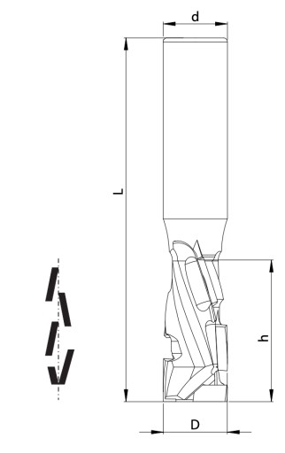 Ekonomiczny frez trzpieniowy prosty typ TJD-073 z możliwością 3-4 krotnego ostrzenia. Nowa konstrukcja freza TJD-073, a w tym rozmieszczenie ostrzy, pozwala na lepsze odprowadzanie wióra podczas frezowania, co jednocześnie przekłada się na wydłużenie żywotności narzędzia oraz zwiększenie jakości obróbki. Do użytku na CNC. Odpowiednia geometria ostrzy sprawia że zęby dociskają laminat górny od góry, i zarówno dolny od dołu, co minimalizuje wyrywanie laminatu.