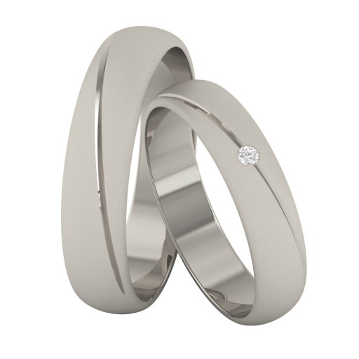 Półokrągłe obrączki o matowanym wykończeniu. Zdobione diamentowanym nacięciem, które przepięknie się mieni. W damskiej obrączce dodatkowo zakuto okazały, błyszczący kamień. To wspaniała pamiątka tej jednej z najpiękniejszych chwil, która będzie promieniować szczęśliwym wspomnieniem przez całe Wasze życie.