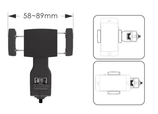 - Uchwyt na telefon posiada gwint żeński 1/4", dzięki czemu można go zamocować na każdym statywie, monopodzie ze standardowym gwintem męskim 1/4"