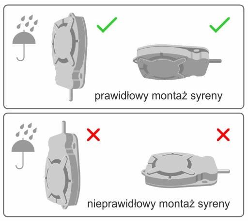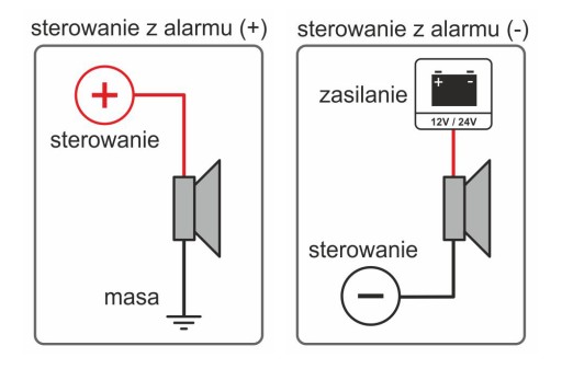 Syrenę można sterować z alarmu wyjściem podającym sygnał „+” jak i masę „-”
