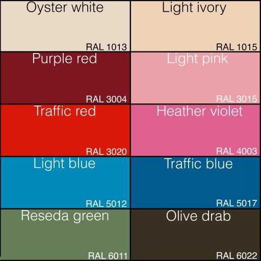Ważne!!! Kolor dobierany jest z palety RAL (wzornik widoczny na zdjęciu) wedle życzenia klienta. Po zakupie proszę w wiadomości do sprzedającego („ważne informacje dla sprzedającego”) podać wybrany nr koloru.