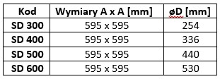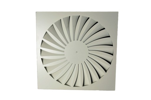 SD - Anemostat wirowy kasetonowy posiada 24 skośne szczeliny promieniowo rozmieszczone, co zapewnia równomierne rozprowadzanie strumienia powietrza przy niskiej emisji hałasu.