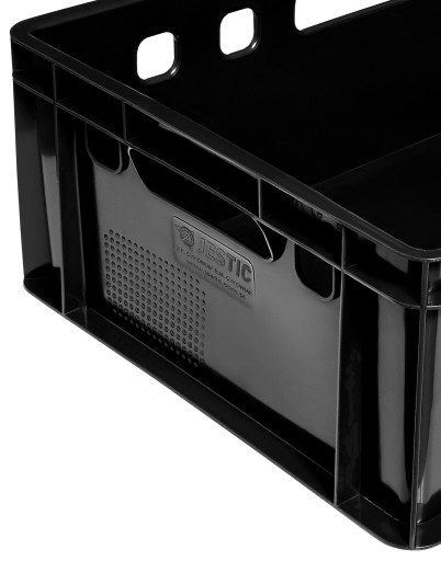 - Dodatkowe otwory boczne wraz z uchwytami umożliwiają cyrkulację powietrza wewnątrz pojemnika przy piętrowaniu skrzynek.