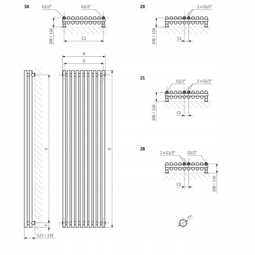 Grzejnik dostępny też w innych rozmiarach na innych naszych aukcjach - poniżej rysunki i tabela z danymi technicznymi
