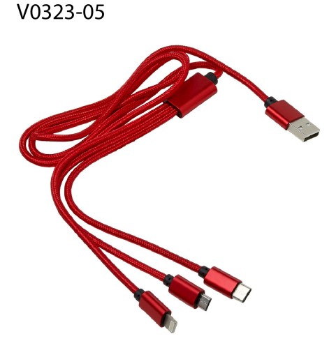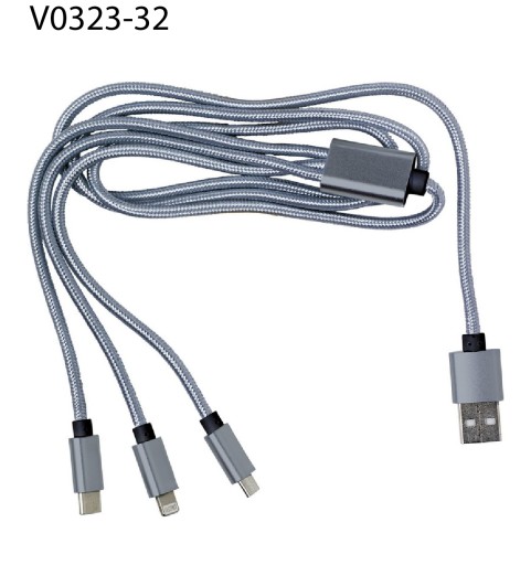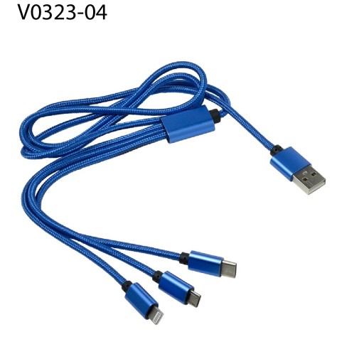 Kabel do ładowania z 4 końcówkami: USB, typu C, micro USB oraz kompatybilną z urządzeniami iOS.