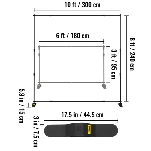 Ta ramka do tła ma regulowaną szerokość i wysokość poprzez wkręcanie kijków na miejsce. Obsługuje dowolny rozmiar banera od 6 x 3 ft/180 x 95 cm do 10 x 8 ft/300 x 240 cm.