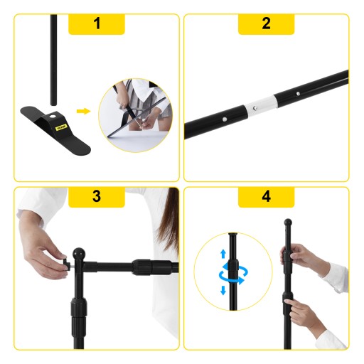 Konfiguracja w kilka minut: nasz stojak w tle jest łatwy do złożenia i demontażu przez jedną osobę w ciągu kilku minut. Nie są wymagane żadne profesjonalne instalatory ani dodatkowe narzędzia. Wystarczy zainstalować podstawy za pomocą wyposażonych śrub i klucza, połączyć sekcje słupów i dopasować ramę do wymaganego rozmiaru.