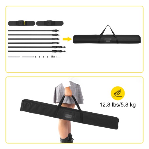 Cały zestaw jest zapakowany w przenośną torbę, która zapewnia oszczędność miejsca i częste podróżowanie. Stojak w tle na imprezy można łatwo przenosić w dowolne miejsce dzięki wadze 13,2 funta/6 kg.