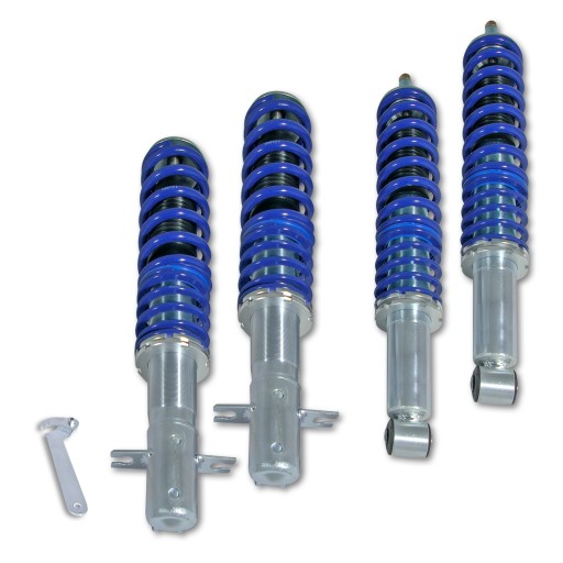 Zestawy zawieszenia Coilover BlueLine to wysokiej klasy komponenty zawieszenia do samochodu z obniżeniem przedniej osi między 25-80 mm i tylnej między 25-80 mm. Zakres regulacji umożliwia indywidualne opuszczanie samochodu. Zestawy mają ogromne pochłanianie siły poprzecznej. Początkowe napięcie sprężyny utrzymuje się w pełnym zakresie regulacji. Regulacja po instalacji.