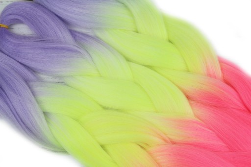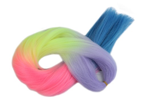 Włosy syntetyczne w przepięknym wariancie kolorystycznym -fioletowo-żółto-różowo-niebieskim. Wykonane z gładkiego i przyjemnego w dotyku henlonu.