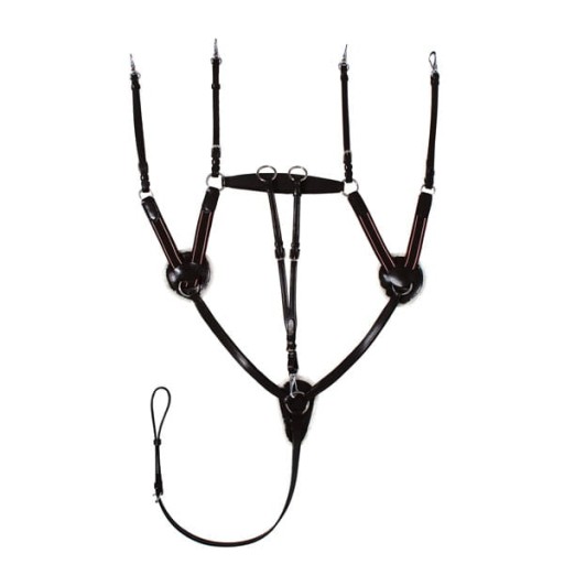 Pięciopunktowy napierśnik z odpinanym wytokiem wykonany z najwyższej jakości skóry. Miejsca ucisku zostały podszyte owczą skórą, a elastyczna wstawki zapewniają swobodę ruchu jednocześnie zapobiegając przesuwaniu się siodła. Okucia wykonane ze stali nierdzewnej.