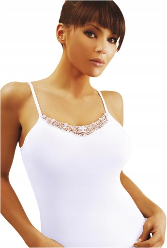 Koszulka damska na cienkich ramiączkach z ozdobnym, haftowanym dekoltem.