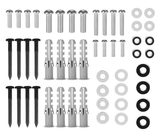 W zestawie z uchwytem otrzymujesz uniwersalne akcesoria montażowe które powinny być odpowiednie do większości montowanych telewizorów. Jeśli w uniwersalnym zestawie będzie brakowało odpowiednich śrub do Twojego telewizora, należy je dokupić we własnym zakresie w pobliskim sklepie z narzędziami.