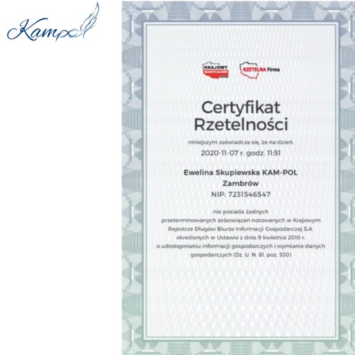 Nasz produkt to gwarancja jakości potwierdzona certyfikatem. Dumni jesteśmy z faktu, że spełniamy najwyższe standardy branżowe, co potwierdza oficjalny certyfikat, który otrzymaliśmy. To dla nas nie tylko zobowiązanie do doskonałości, ale także gwarancja dla naszych klientów, że nasze produkty są w pełni zgodne z normami i przepisami.