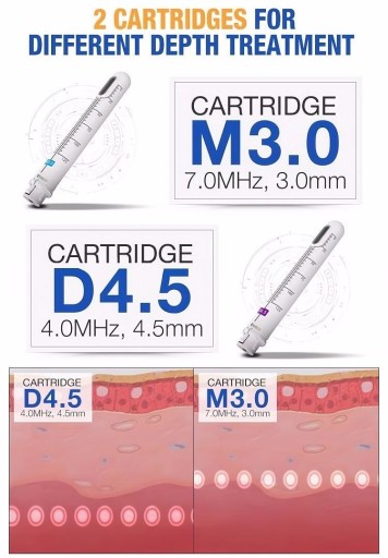 4.5mm cartridge--- the ultrasound to penetrate the skin to a depth of 4.5mm, direct subcutaneous SMAS layer, targeted to thicker skin, such as cheeks, neck, etc.