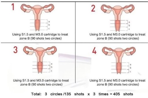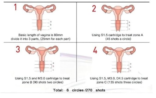 3.0mm head produce energy up to submucosal tissue accelerate cell activity and make the collegen regrowth and restructuring, increase mucous elasticity and meke vaginal muscle tighten.