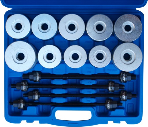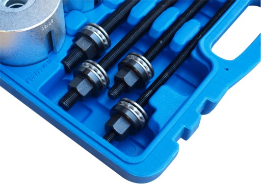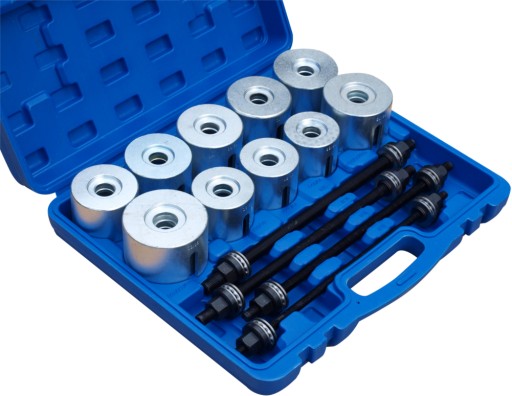 Zestaw służy do montażu i demontażu łożysk w zwrotnicach oraz tulejek zawieszenia. W zestawie prasa śrubowa i adaptery. Wszystko w eleganckiej walizce.