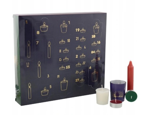 - W kalendarzu znajdziesz : podgrzewacze , świece do kolacji , jak i świece zapachowe w szklanym pojemniku