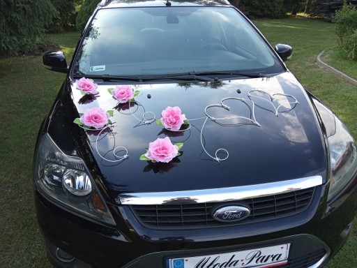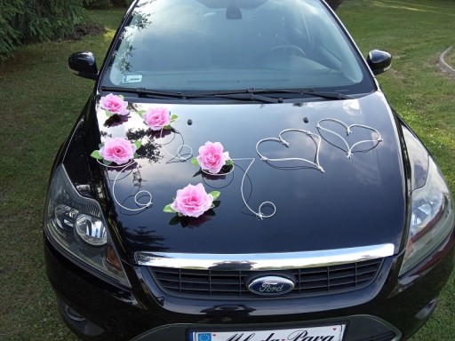 Dekoracja mocowana jest na samochodzie za pomocą przyssawek florystycznych (przyssawki są już przymocowane do dekoracji).