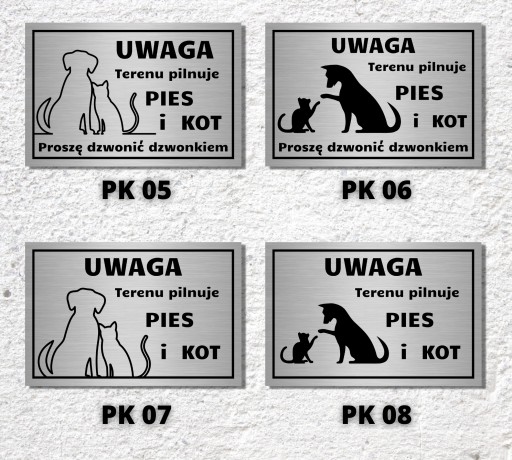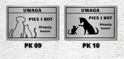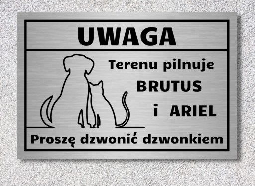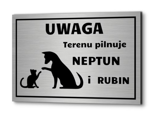 - Tabliczkę informacyjną "Uwaga pies i kot" wykonaną na zamówienie zgodnie z podanymi informacjami