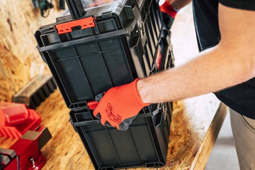 - Uszczelka w pokrywie pozwala w szybki i bezpieczny sposób umyć skrzynie (np. myjką ciśnieniową) bez ryzyka zalania narzędzi.