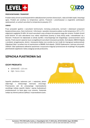- Szpachla plastikowa do zapraw i klejów szerokości 225 mm z zębem 5mm x 5mm – 1 szt.