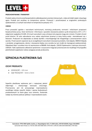 - Szpachla plastikowa do zapraw i klejów szerokości 225 mm z zębem trójkątnym 5mm x 5mm – 1 szt.