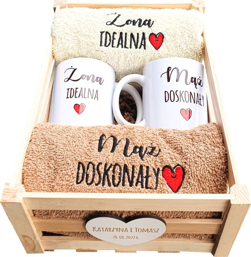 Hafty na ręcznikach oraz nadruki na kubkach są stałe (mąż doskonały oraz żona idealna) i nie podlegają modyfikacjom.