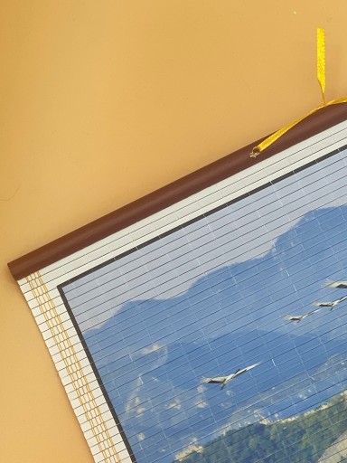 wyposażony w zawieszkę ,wydrukowany na zaplecionym oryginalnym papierze trzcinowym .Na dole i górze kalendarza dwa drewniane wałeczki spowodują ,że będzie się należycie prezentował na ścianie.