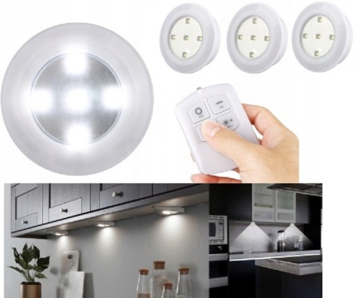 Zestaw składa się z 3 oprawek z 5 diodami LED i pilota do zdalnego sterowania oświetleniem.
