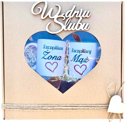 - modne opakowanie w postaci eko kartonu z okienkiem w kształcie serca. Na opakowaniu widnieje drewniany napis "W dniu ślubu", całość przewiązana jest jutowym sznurkiem i ozdobiona drewnianym sercem. Rozmiar opakowania 30x30x10 cm.
