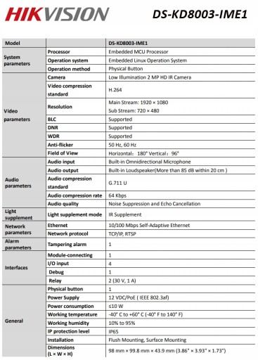 DS-KD-8003-IME1(B) to podstawowa jednostka modułowego systemu wideodomofonowego marki Hikvision. Urządzenie składa się kamery typu "rybie oko" o rozdzielczości FullHD. dwukierunkowego systemu komunikacji głosowej oraz przycisku wywołania wraz z wizytownikiem.