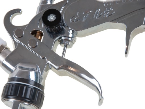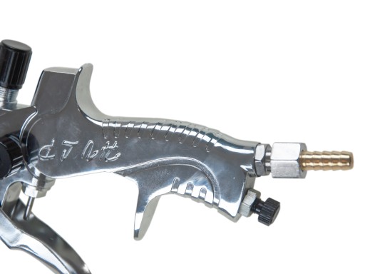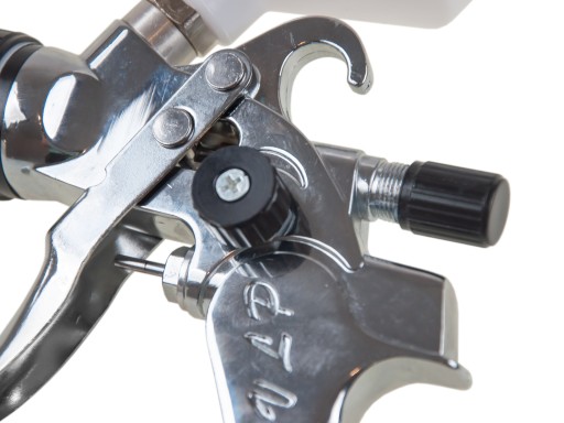 ☑️powietrza odbywa się z wykorzystaniem regulatora powietrza zamontowanego przed pistoletem w sieci pneumatycznej oraz bardziej precyzyjnie za pomocą pokrętła w dolnej części rekojeści pistoletu.