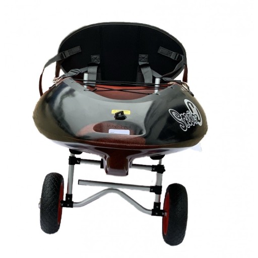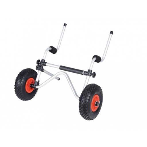 Rama wózka została osadzona na szerokich kołach AIRLESS nie wymagających pompowania a pionowe sztyce można regulować ustawiając ja na żądaną szerokość tak aby trafiały w otwory w kajaku. Całość w szybki sposób możemy zdemontować tak aby zajmowało jak najmniej miejsca w kajaku.