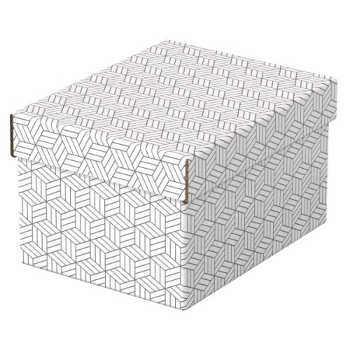 Zestaw trzech nowoczesnych i stylowych tekturowych pudełek ze zdejmowaną pokrywą, idealnych do zapakowania prezentów lub szybkiego wykreowania w domu nowego miejsca do przechowywania. Można je używać oddzielnie lub ustawiać na półkach i regałach, aby mniejsze rzeczy, takie jak zdjęcia czy dokumenty osobiste były przechowywane w uporządkowany i łatwy do znalezienia sposób. Dodaj wstążkę i zapakuj prezent! Po wyjęciu prezentu obdarowany może wykorzystać pudełko do przechowywania różnych rzeczy, dzięki czemu otrzyma 2 prezenty w jednym. Wykonane z mocnej tektury falistej, w 100% pochodzącej z recyklingu i w 100% nadającej się do ponownego przetworzenia, opatrzonej certyfikatem FSC. Mają gładką, łatwą do czyszczenia powierzchnię z dwukolorowym, geometrycznym wzorem, dopełniającym styl wnętrza. Pudełka są dostarczane na płasko, do samodzielnego złożenia, a ich montaż jest szybki i łatwy. Po złożeniu boki pudełka tworzą podwójne śianki, dzięki czemu pudełka są mocne i dobrze chronią zawartość. Wszystkie mają ten sam rozmiar.