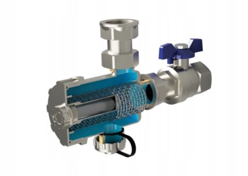 W komplecie znajduje się: Kurek kulowy prosty z półśrubunkiem, Śrubunek, Filtr magnetyczny, Klucz