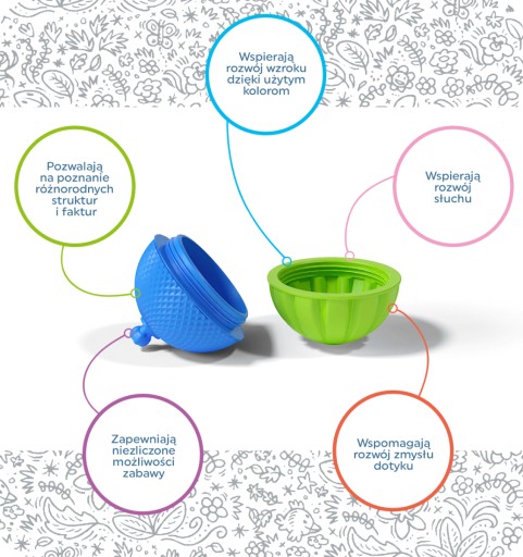 Zabawka wspiera prawidłowy rozwój dziecka. Pobudza wszystkie ośrodki zmysłu u dziecka: wzrok, słuch, węch, smak oraz dotyk.