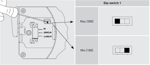 Za pomocą np. śrubokręta przesuwamy przełącznik DIP-SWITCH by uzyskać żądany skok - 180 lub 380 mm.