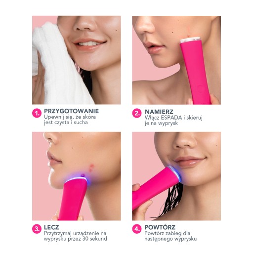 Działanie ESPADA opiera się na terapii impulsami niebieskim światłem LED oraz pulsacjami T-Sonic, aby z chirurgiczną precyzją usuwać wypryski i trądzik już u źródła ich powstania.