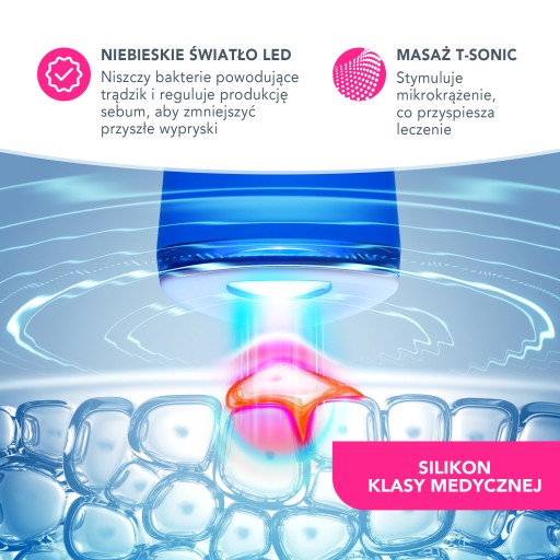 Niebieskie światło oraz pulsacje T-Sonic™ aktywują się w momencie kontaktu urządzenia ze skórą. Przytrzymaj urządzenie w okolicach wyprysku przez 30 sekund.