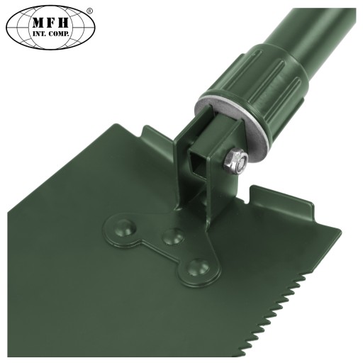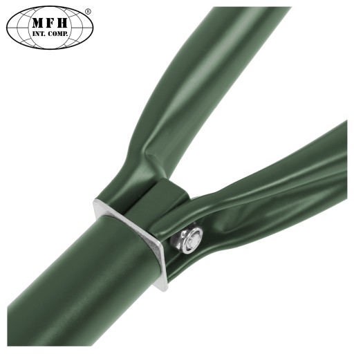Stalowy trzonek wyposażony jest w solidną blokadę sprężynową. Uchwyt w kształcie trójkąta umożliwia zawieszenie saperki.