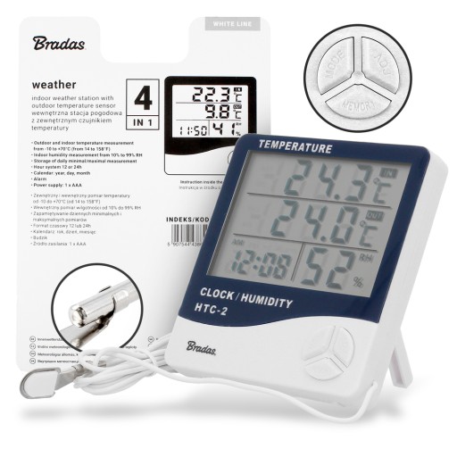 Stacja pogodowa White Line pozwala na pomiar temperatury i wilgotności powietrza wewnątrz budynku. Dzięki specjalnemu przewodowi urządzenie mierzy również temperaturę na zewnątrz. Stacja zapamiętuje dzienne skrajne pomiary, co daje Ci pełny obraz danych.
