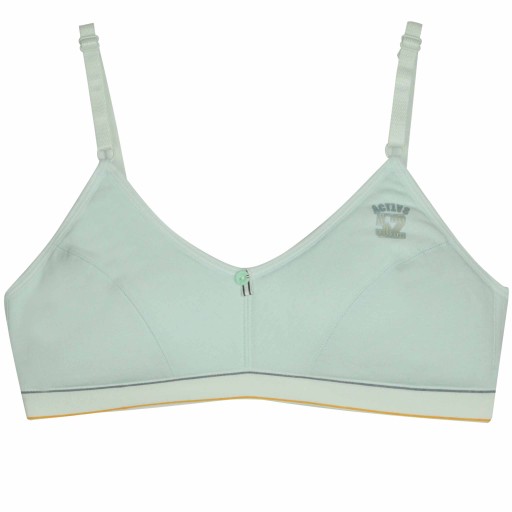 Śliczny stanik w kolorze jasnoniebieskim z niewielkim nadrukiem oraz guziczkiem przy dekolcie. Posiada delikatne przeszycia.