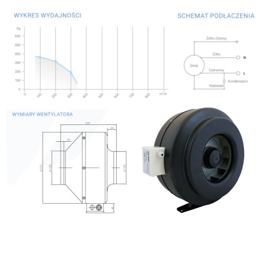 pomieszczenia. Dzięki nowoczesnej konstrukcji wentylator, osiąga wysokie ciśnienie i wydajność przy minimalnym poziomie hałasu.