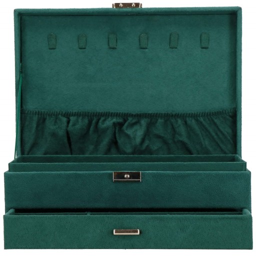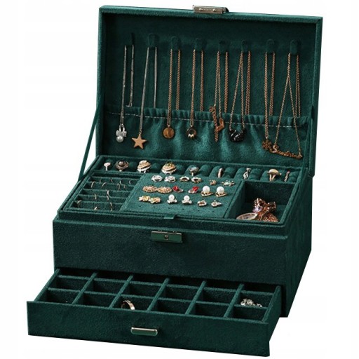 Szkatułka posiada dodatkową dolną szufladkę, z dużymi przegrodami. Dzięki temu możesz pomieścić w środku więcej biżuterii.