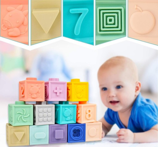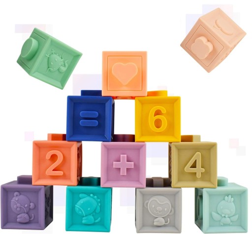 Każdy z klocków posiada wypukłe cyferki, figury geometryczne, kształty, znaki matematyczne, zwierzątka, owoce oraz obrazki. Wpływa to na rozwinięcie zmysłu oraz dotyku. Klocki możemy łączyć ze sobą. Dzięki swojej budowie idealnie sprawdzają się jako gryzaczki dla maluszków. Podczas naciskania - piszczą. Można bawić się nimi w wodzie. Rozwijają koordynację wzrokowo-słuchową i motorykę dziecka.