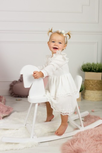 Sukienka Blanca w kolorze śmietankowym. Wykonana z muślinu bawełnianego, obszyta bawełnianą koronką.