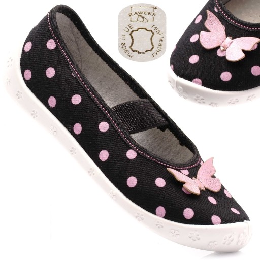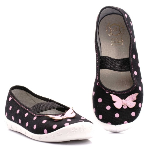 Komfortowe obuwie dziecięce wykonane z bawełnianych tkanin oraz elastycznej podeszwy. Polecane jest jako obuwie na zmianę lub po domu, lecz podczas suchych, ciepłych dni może być użytkowane także na zewnątrz.
